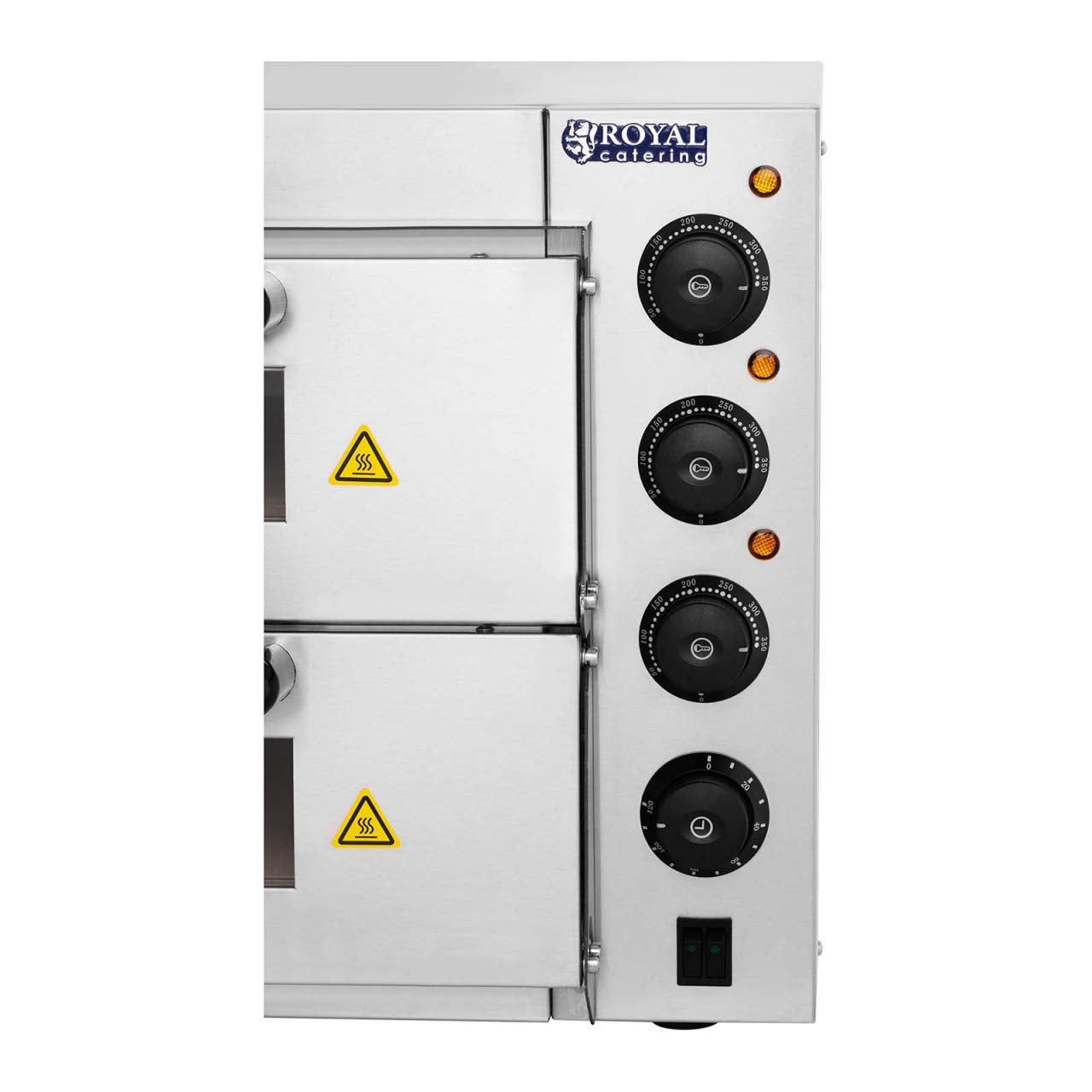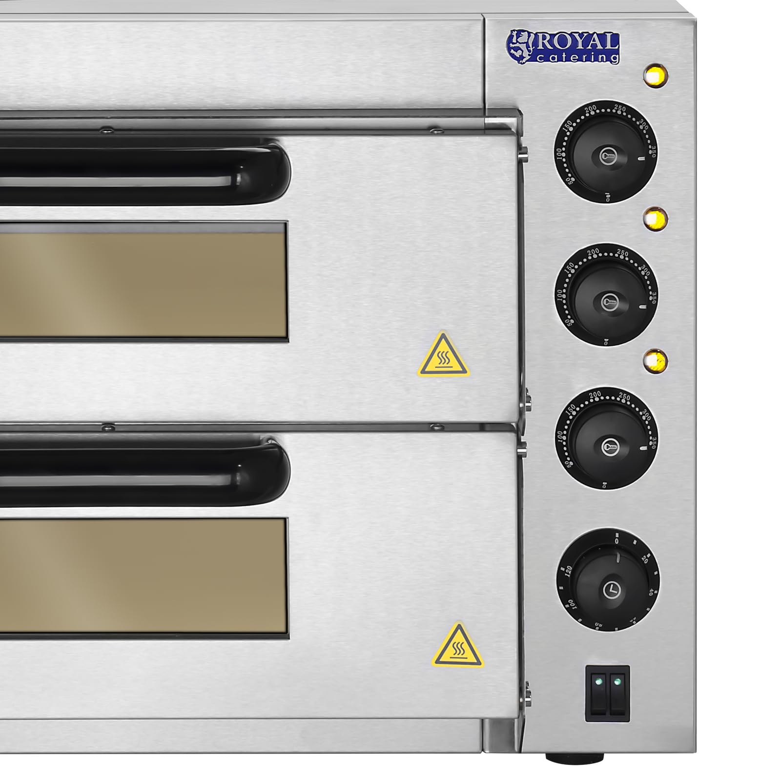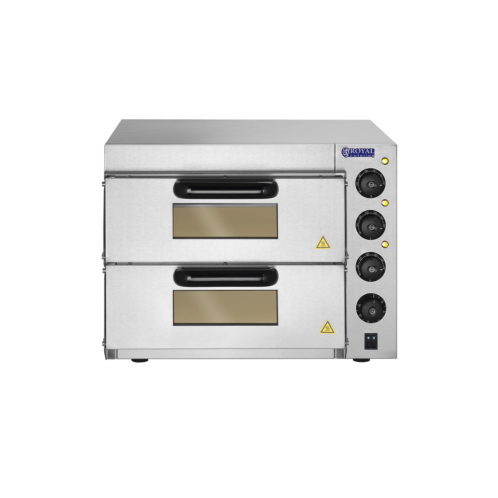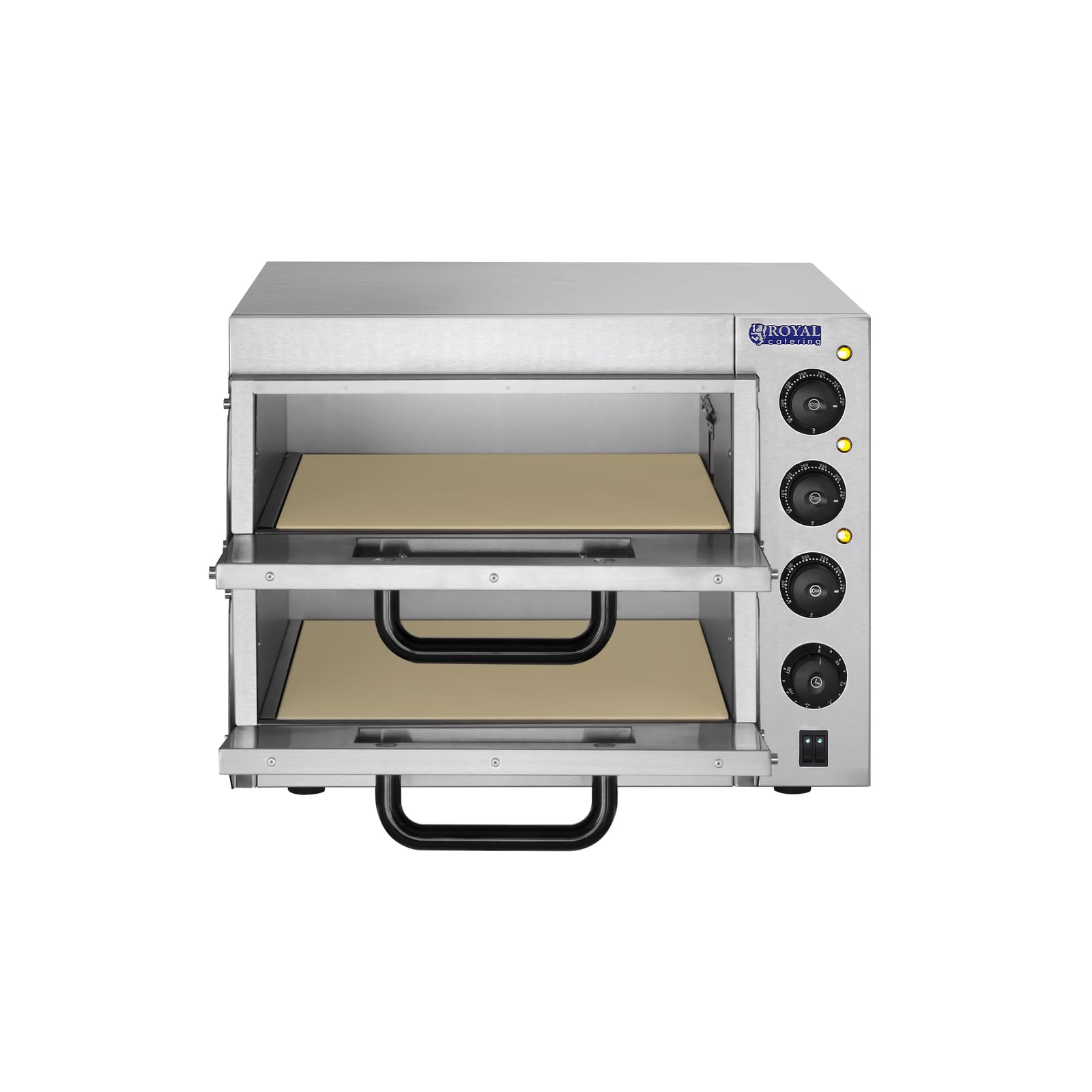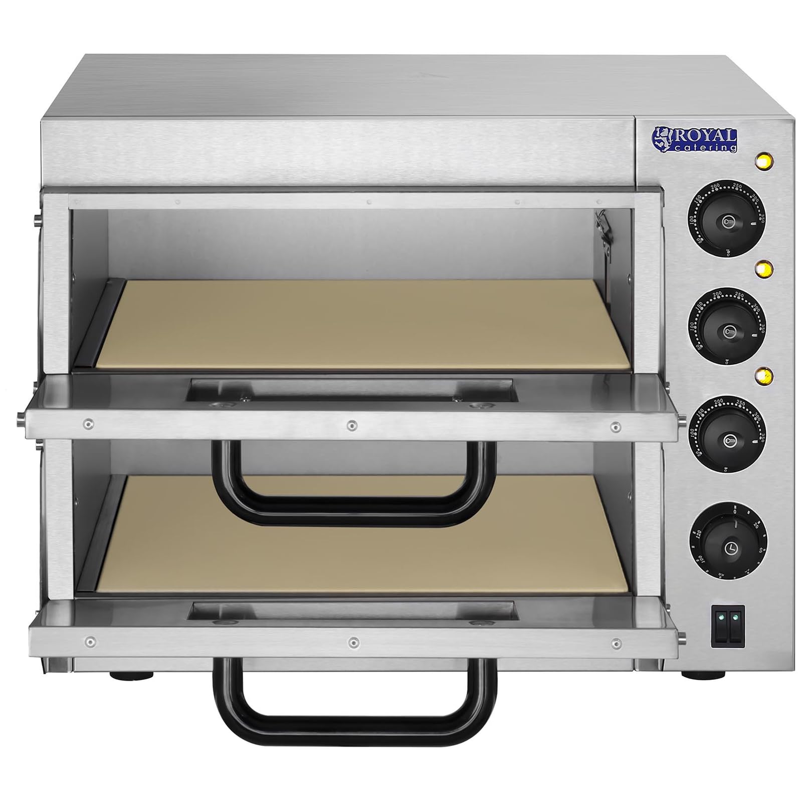 Royal Catering RCPO-3000-2PS-1 Pizzaofen elektrisch 2 Kammern Pizzabackofen Pizza Ofen Schamotte Schamotteboden (3000W, 2 Schamotte-Steinböden: 40 x 40 x 1,5 cm, Timer bis 120 min, Edelstahl)