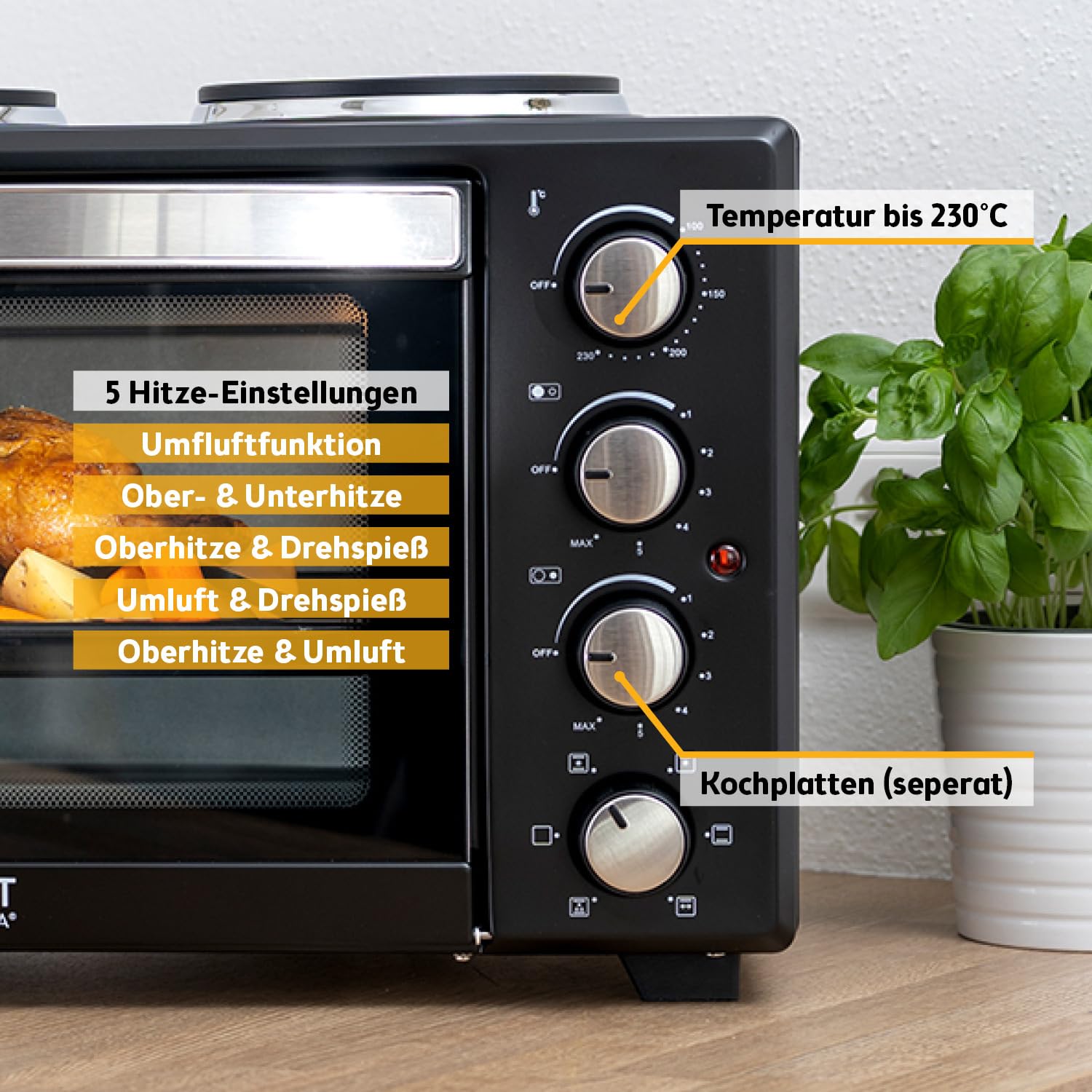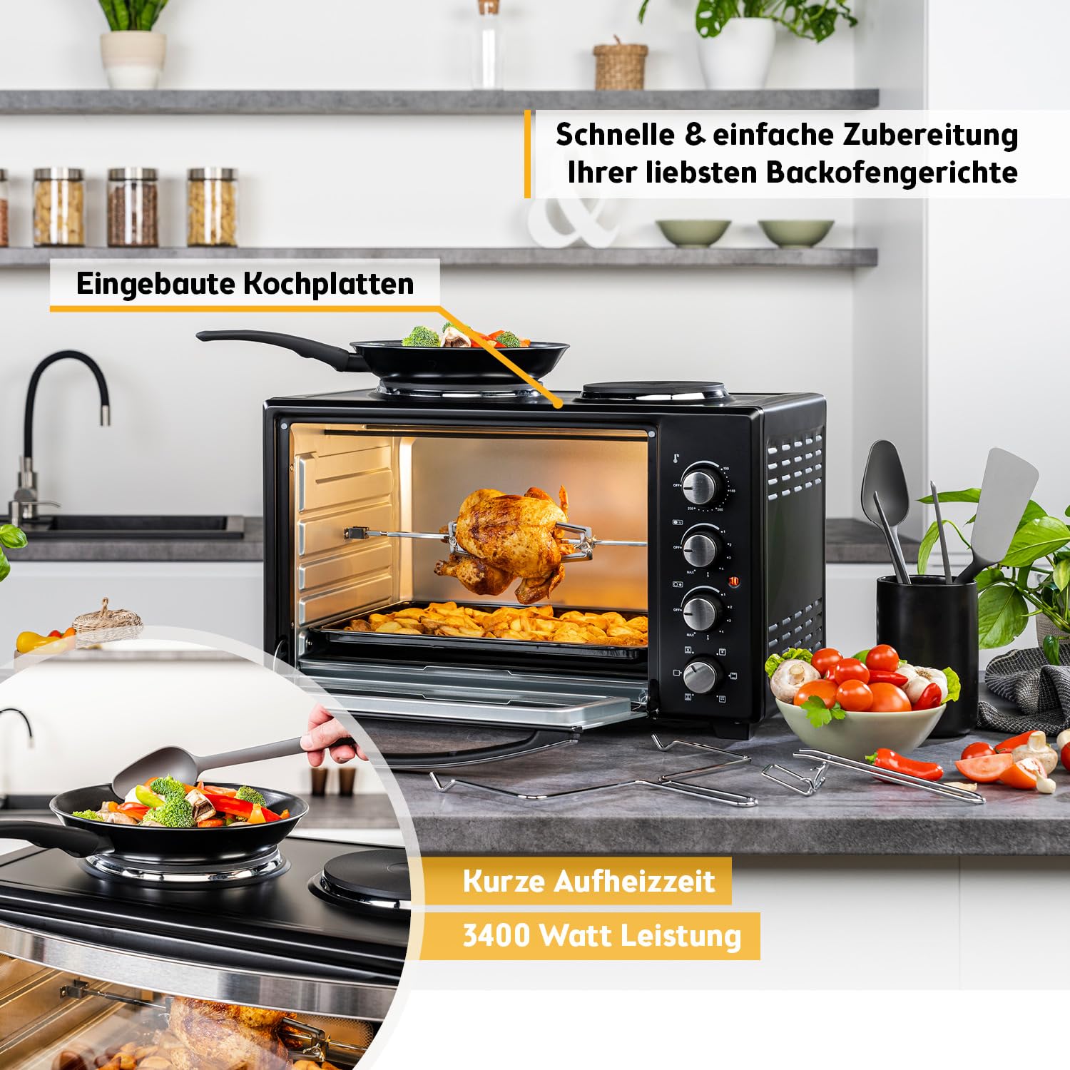 TZS First Austria - Minibackofen mit Kochplatten 60L 3200 W - Mini Backofen Pizzaofen mit Herdplatten bis 230°C & 6 Heizmodi - Miniofen Kombigerät mit 4 Einschubhöhen & hochwertigem Zubehör